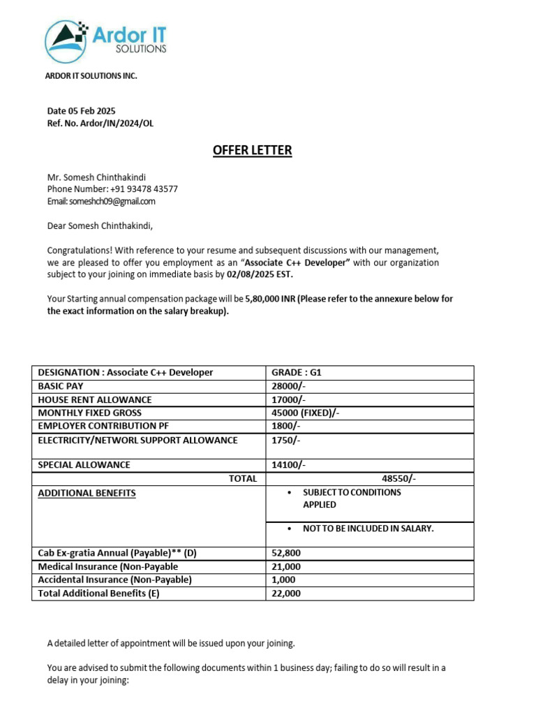 Arvind - C++ - Batch-01 Offer Letter PDF | PDF