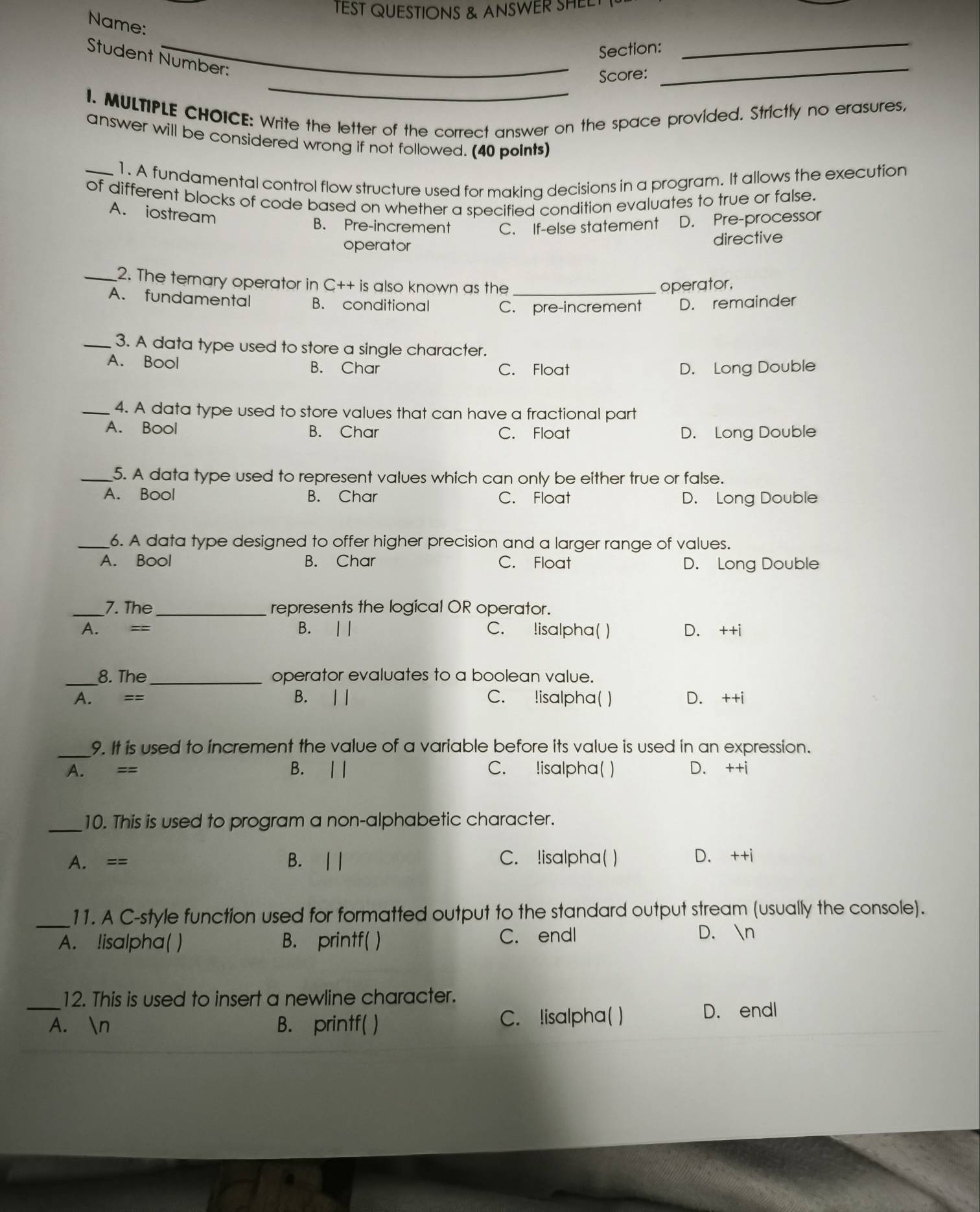 Solved: TEST QUESTIONS & ANSWER SHELT Name: Section: _ _ Student Number ...