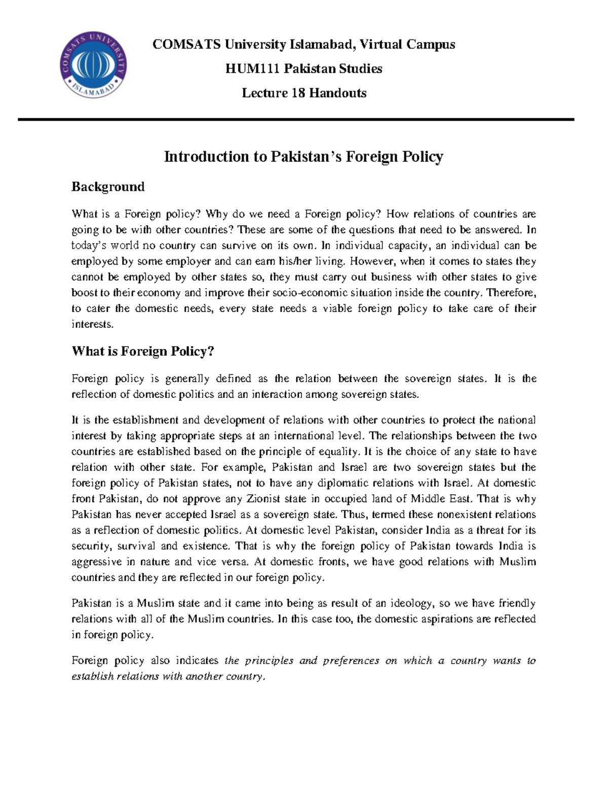 HUM111 Lecture 18 Handouts: Introduction to Foreign Policy in Pakistan ...