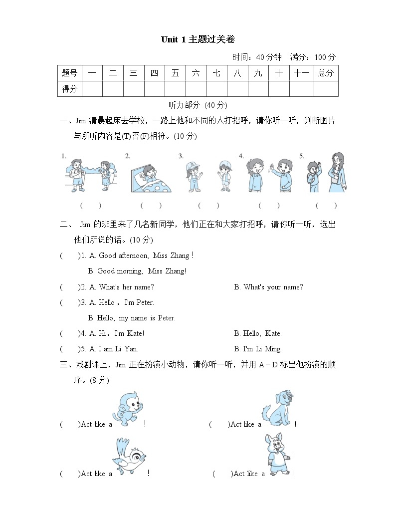 人教精通版三起三年级英语上册Unit1主题过关卷含答案-教习网|试卷下载