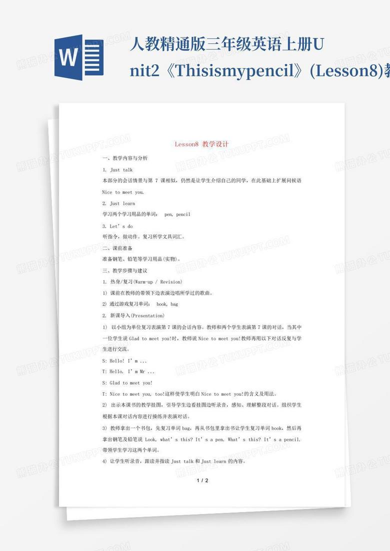 人教精通版三年级英语上册unit2《thisismypencil》(lesson8)教学Word模板下载_编号qkgmwrrp_熊猫办公