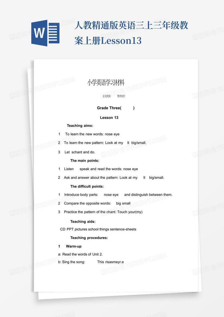 人教精通版英语三上三年级教案上册lesson13Word模板下载_编号lygendvo_熊猫办公
