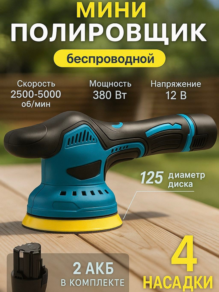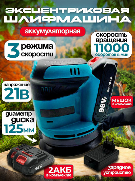 Эксцентриковая шлифмашина, 2 АКБ и 4 насадки в комплекте / Беспроводной ...
