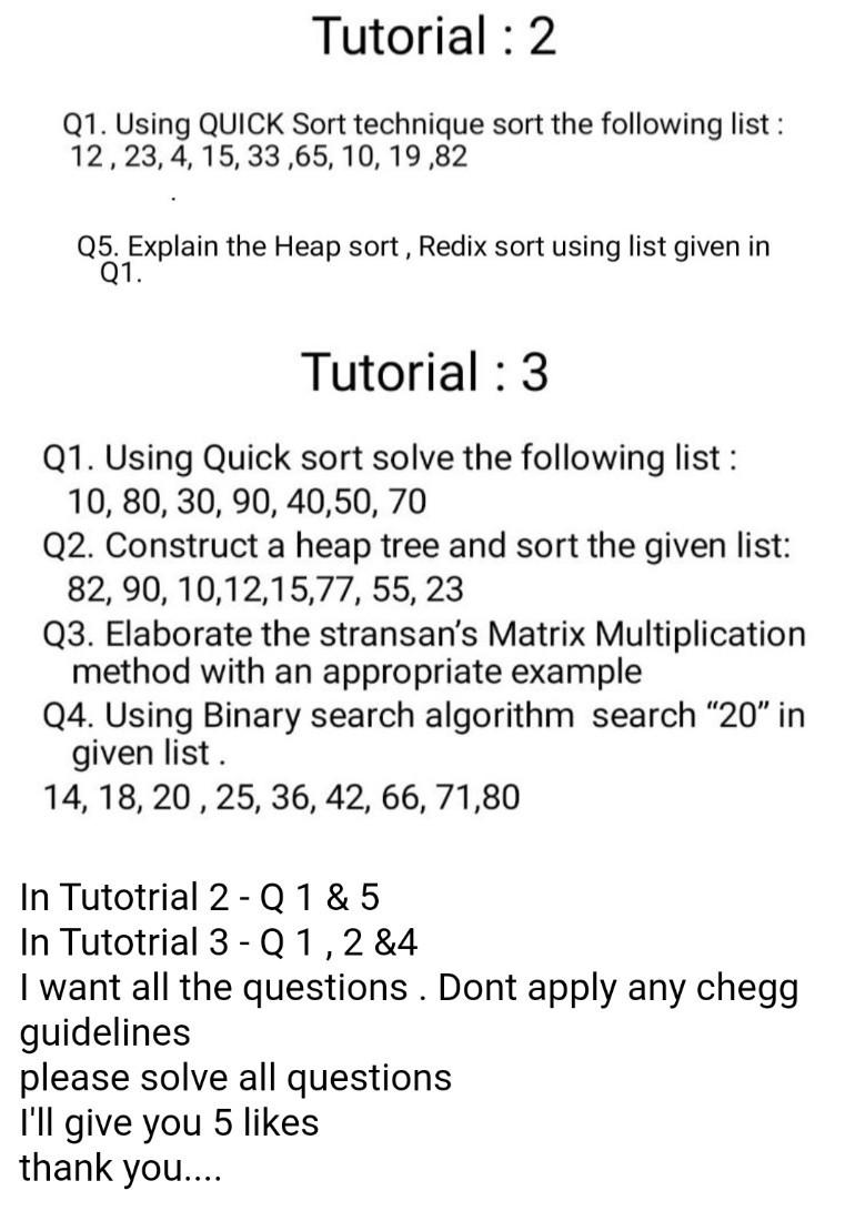 Solved Tutorial : 2 Q1. Using QUICK Sort technique sort the | Chegg.com