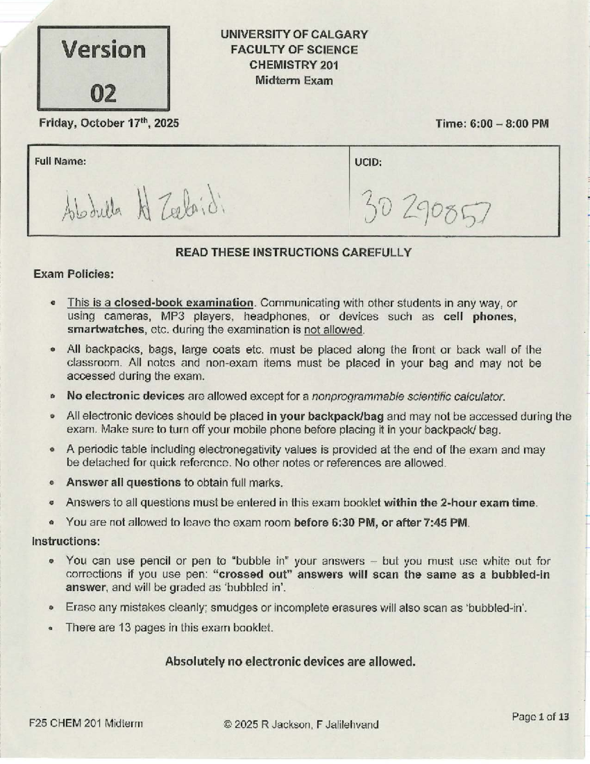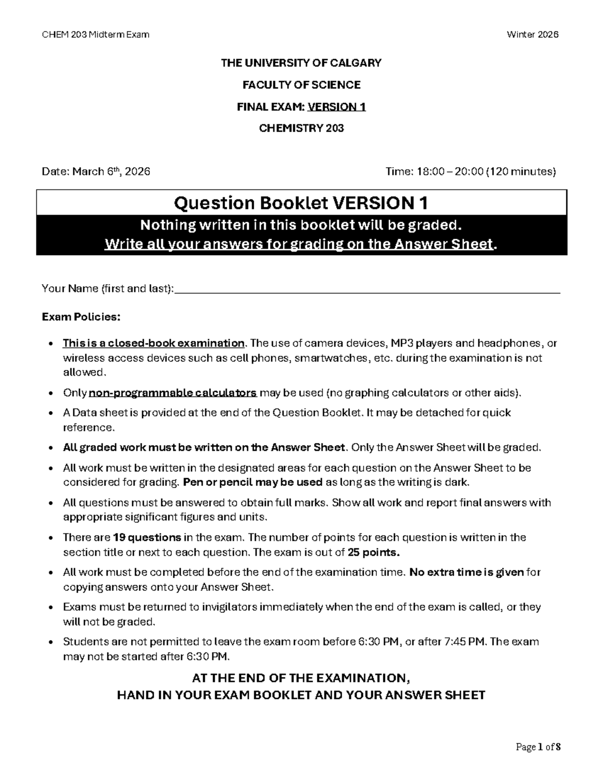 CHEM 203 W26 Midterm Exam Version 1 - Winter 2026 Guide - Studocu
