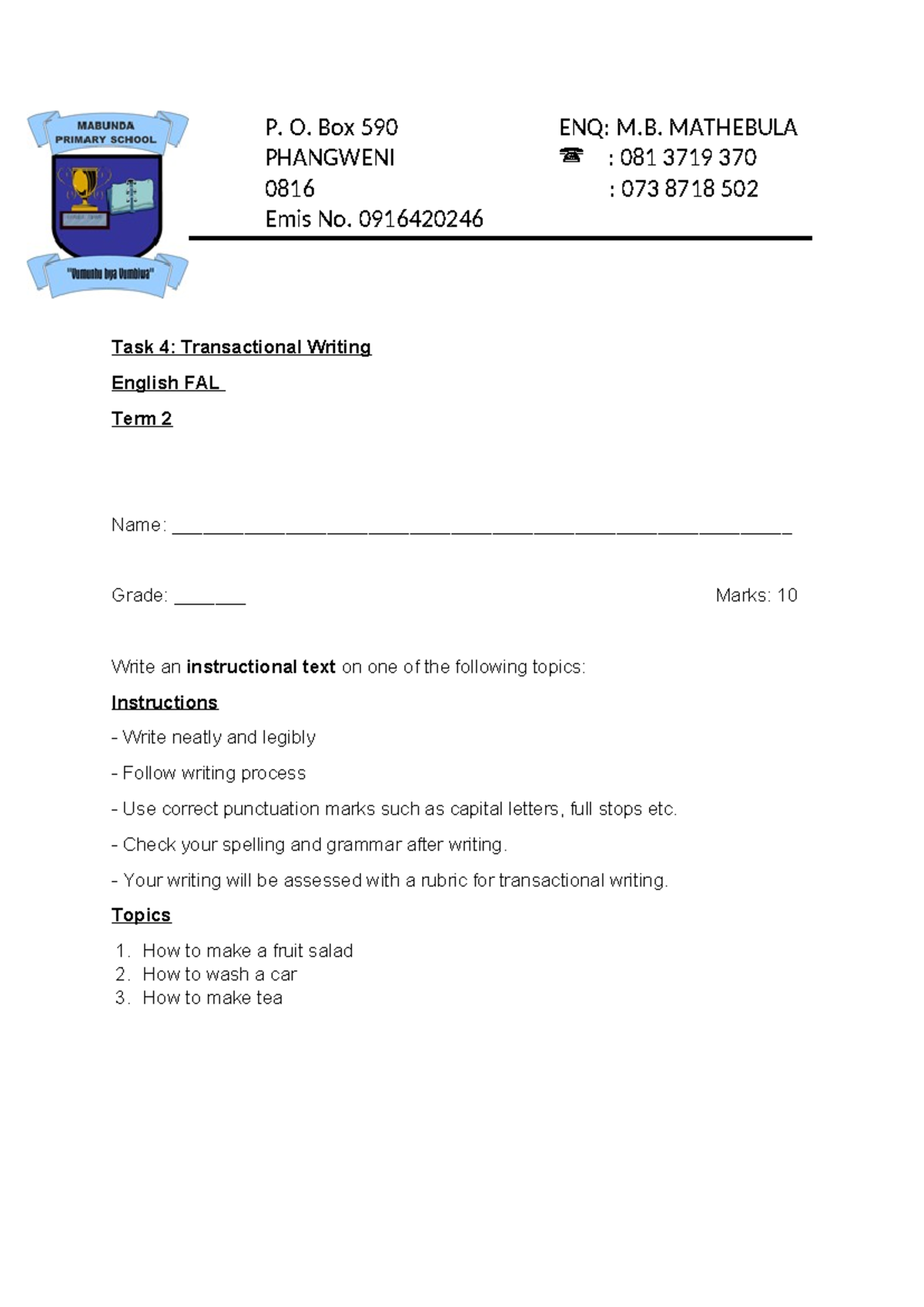 Grade 5 term 2 task - P. O. Box 590 ENQ: M. MATHEBULA PHANGWENI : 081 ...