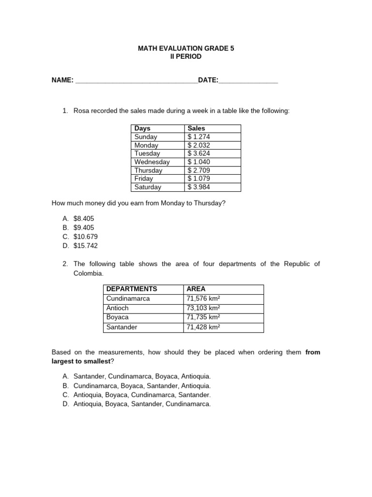 Grade 5 Math Unit 2 Assessment Form B: Problem Solving Tasks - Studocu