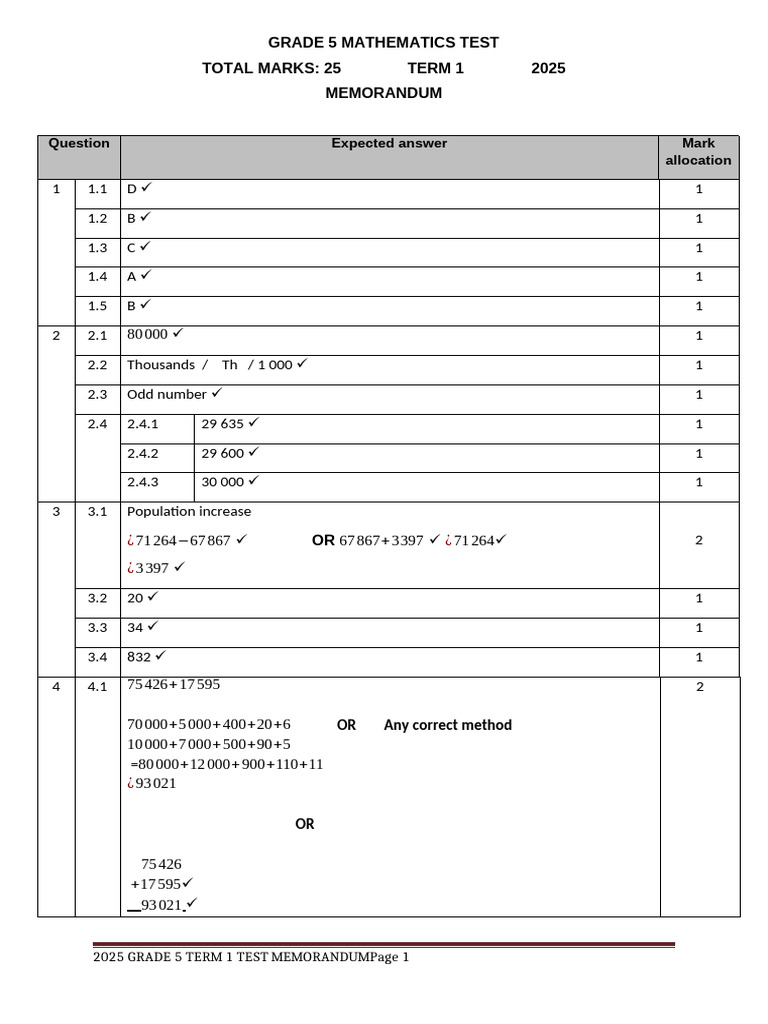 Memo Grade 5 Mathematics Test Term 1 2025 - 080618 | PDF