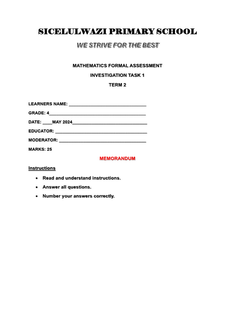 Grade 5 Term 2 Maths Investigation Memo | PDF | Mathematics