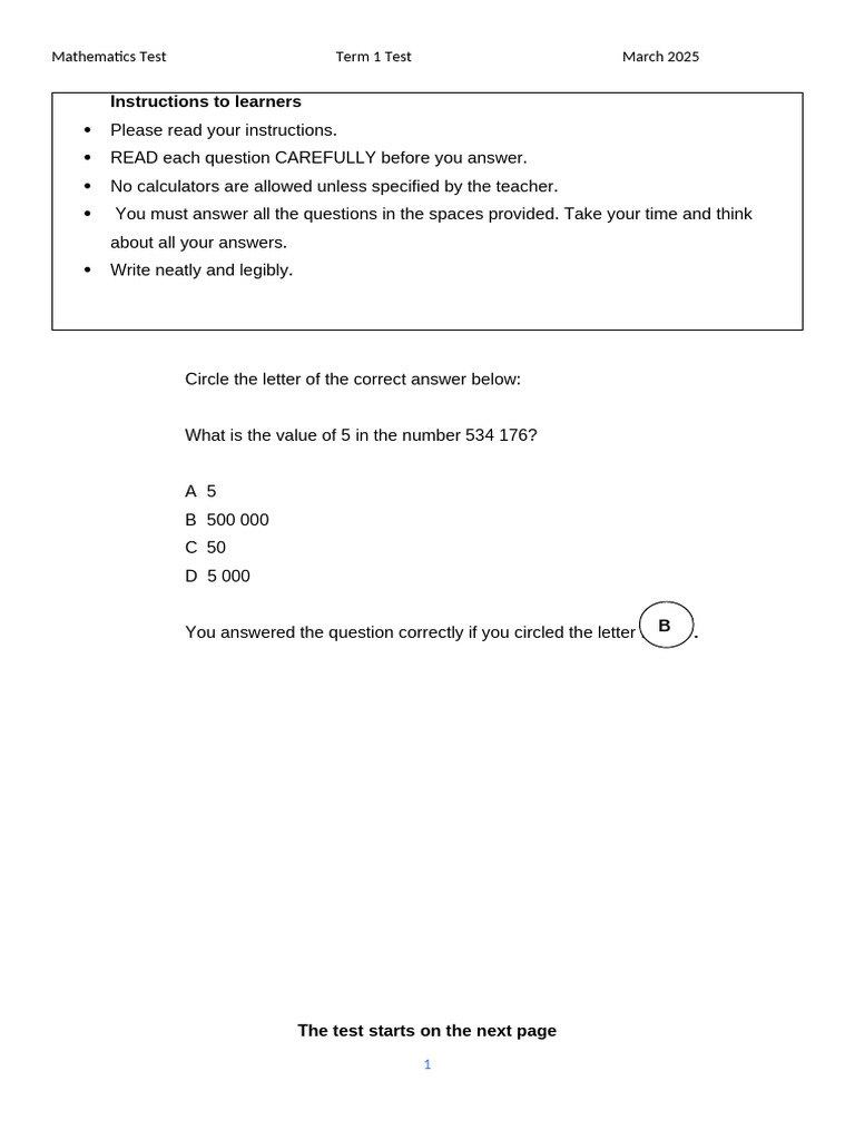 Grade 5 Mathematics - Term 2 - Assessment 1 (CAPS Aligned)