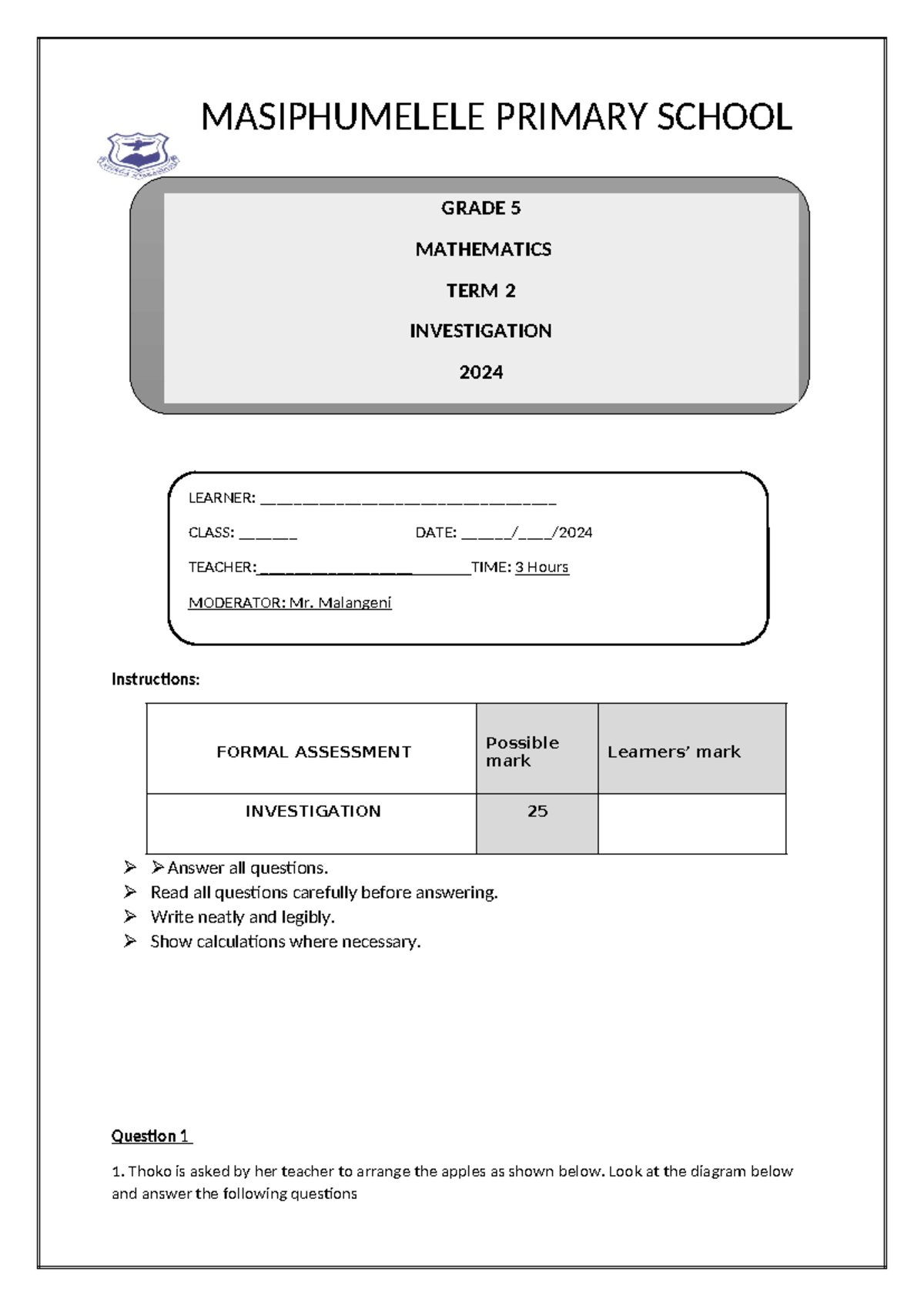 Grade 5 Mathematics Term 2 Assessment – Investigation (2025 ...