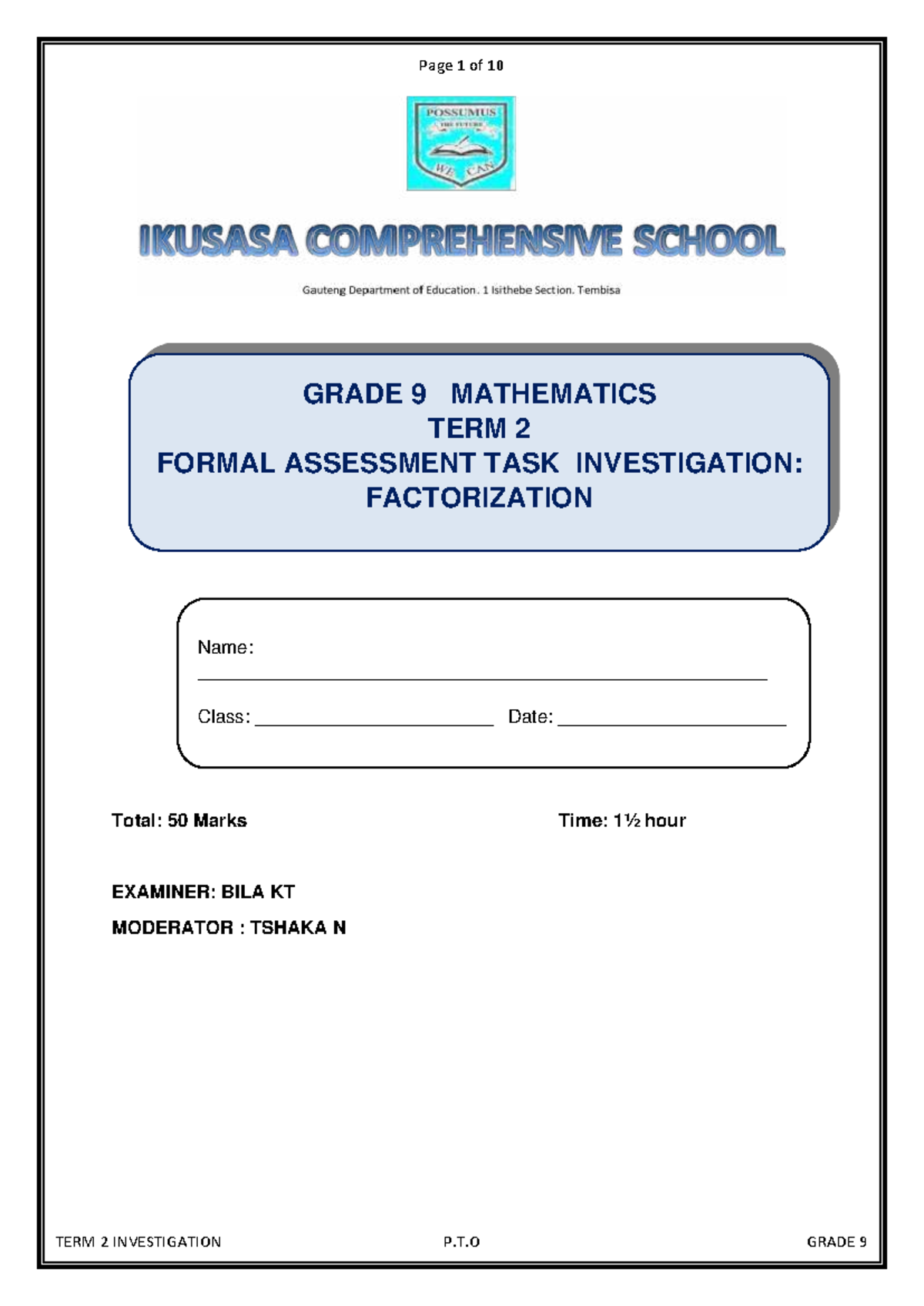 Grade 9 Mathematics Formal Assessment Task: Factorization 2025 - Studocu