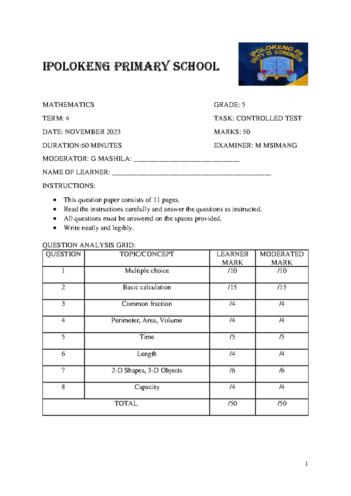 Mathematics Grade 5 Term 4 Controlled Test - November 2023 - Studocu