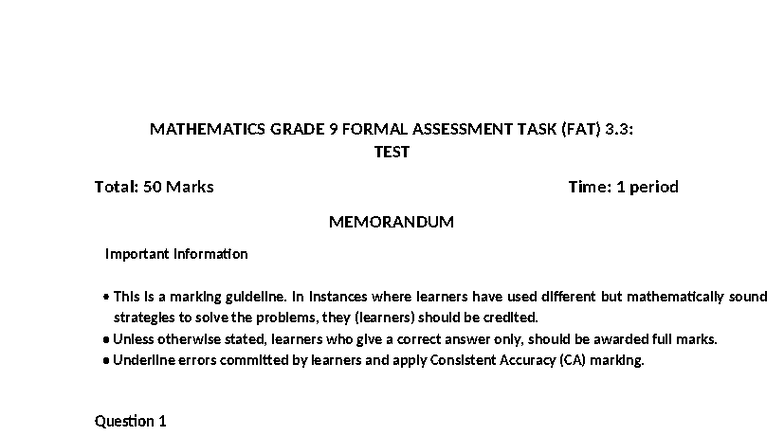 MATHEMATICS GRADE 9 FORMAL ASSESSMENT TASK (FAT) 3.3 MEMO - Studocu