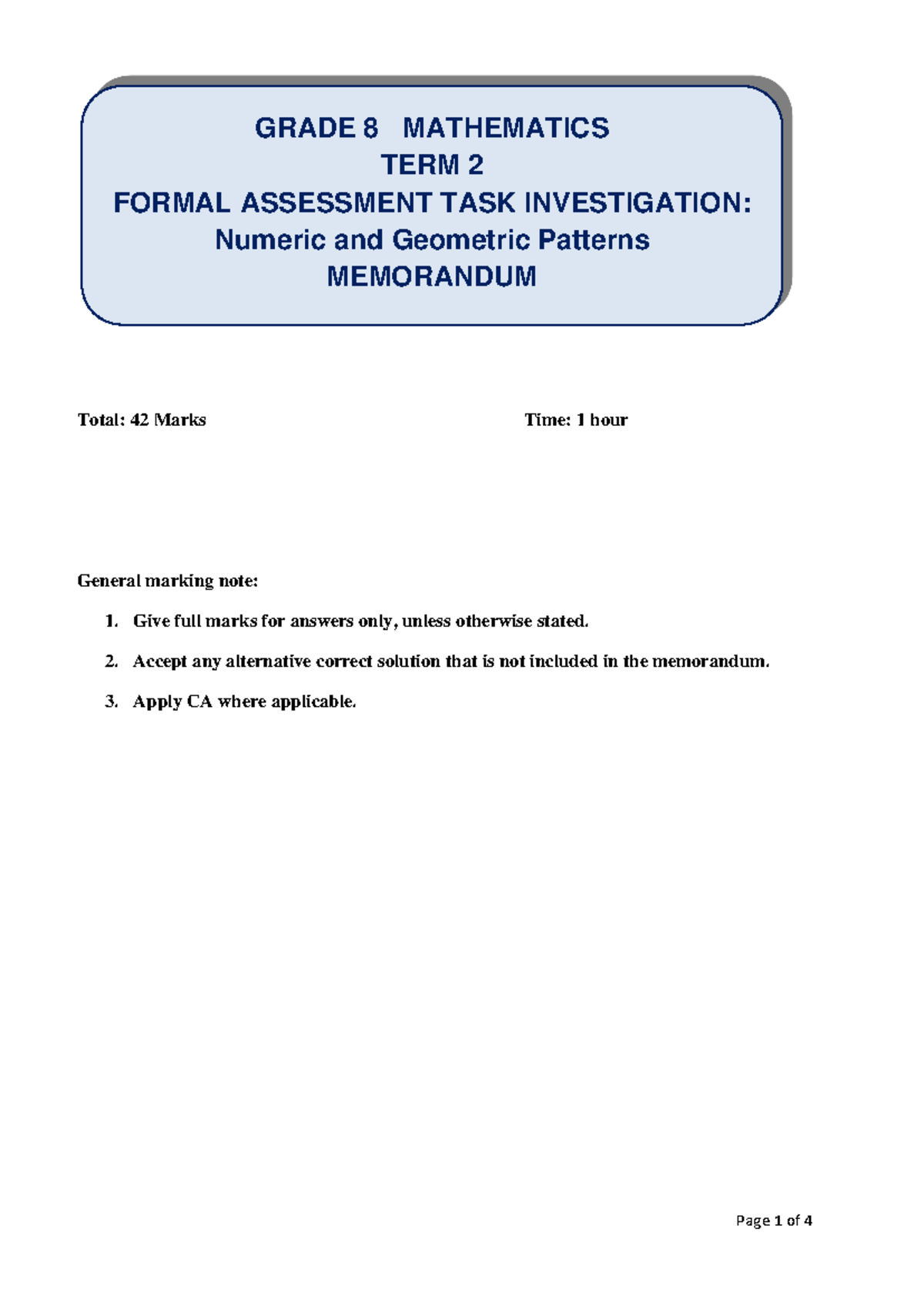Grade 8 Mathematics Formal Assessment Task Memo: Investigation 2021 ...