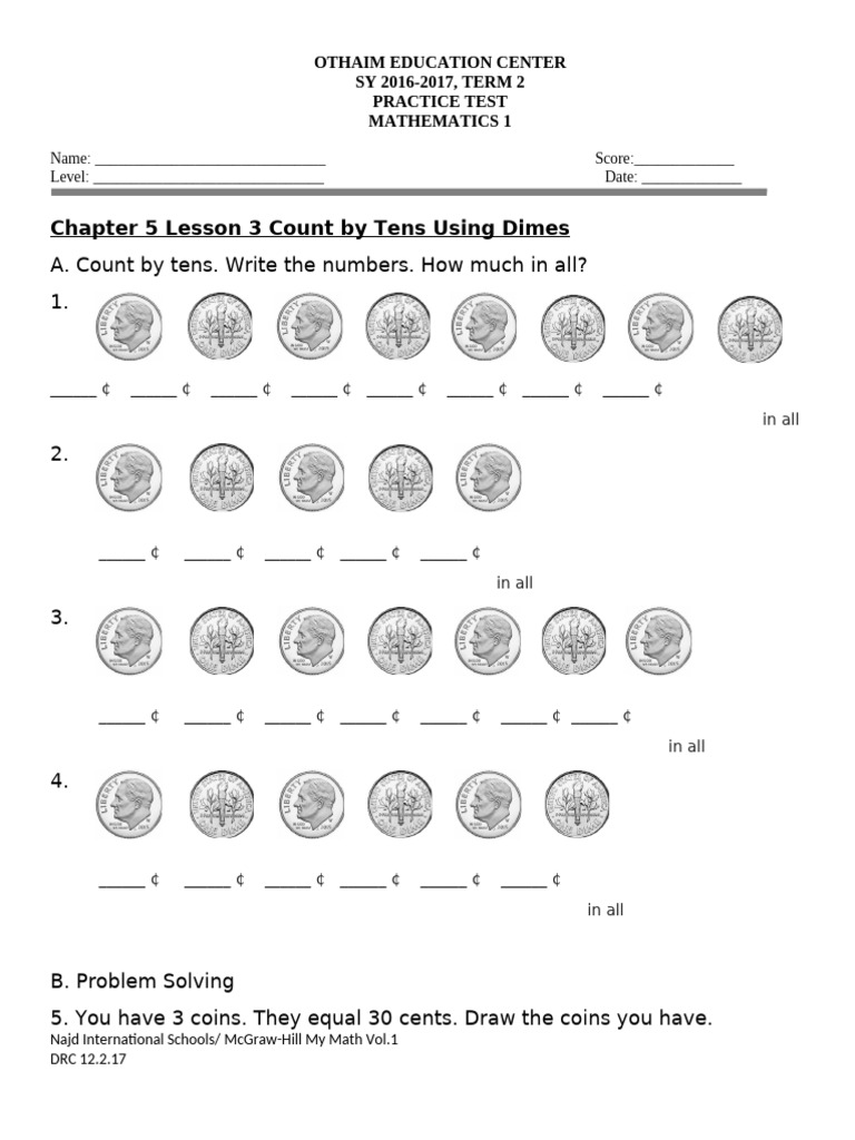 Grade 1 Chapter 5 Lesson 3 Count by Tens Using Dimes | PDF