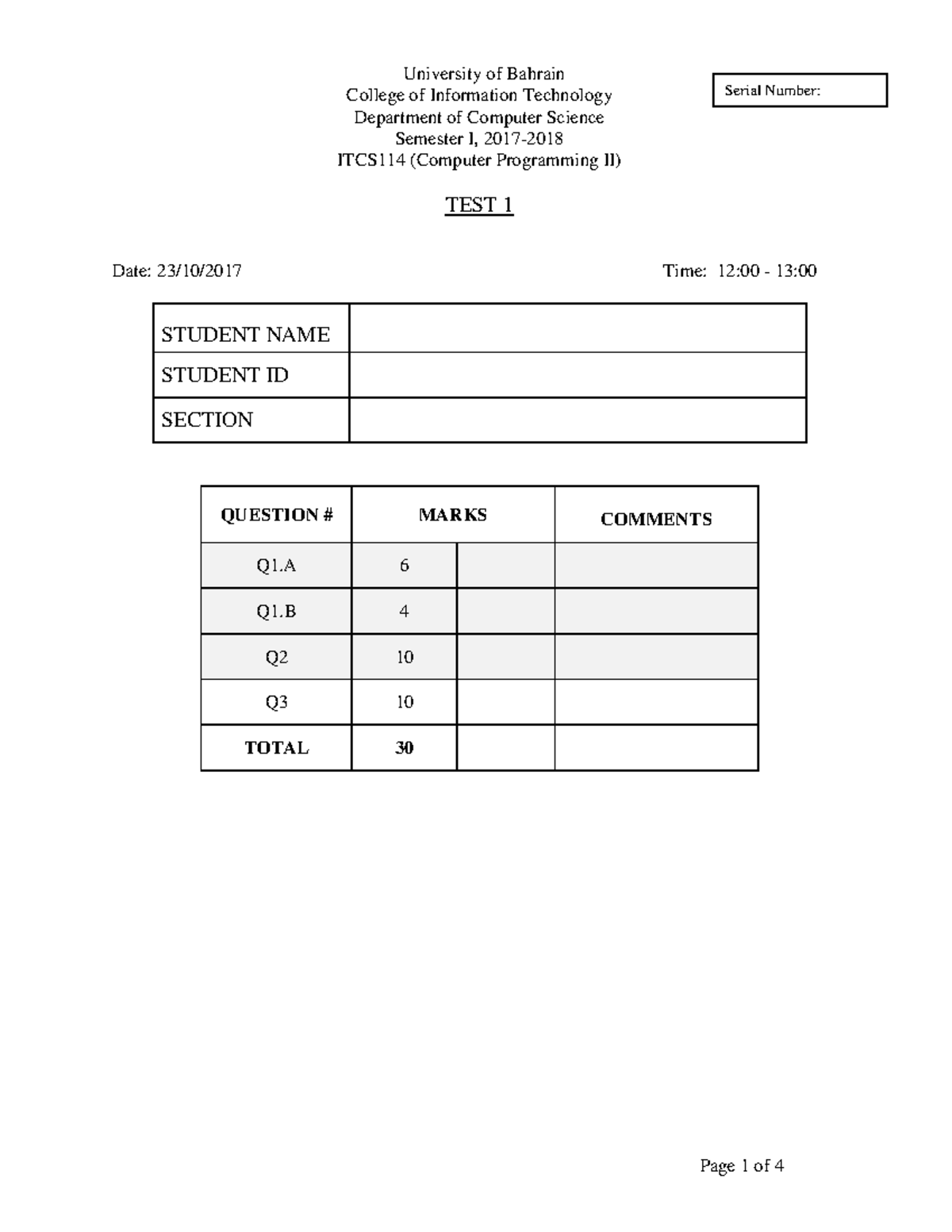 2017-2018 - ITCS114 Test(1)-KEY - University of Bahrain College of ...