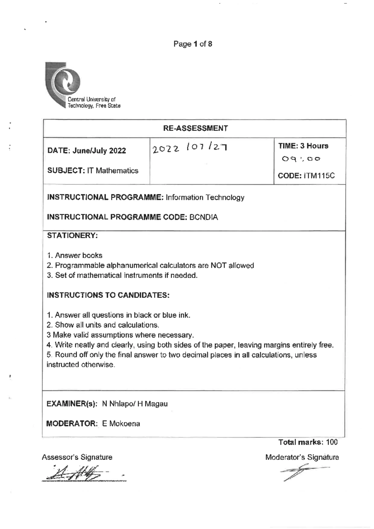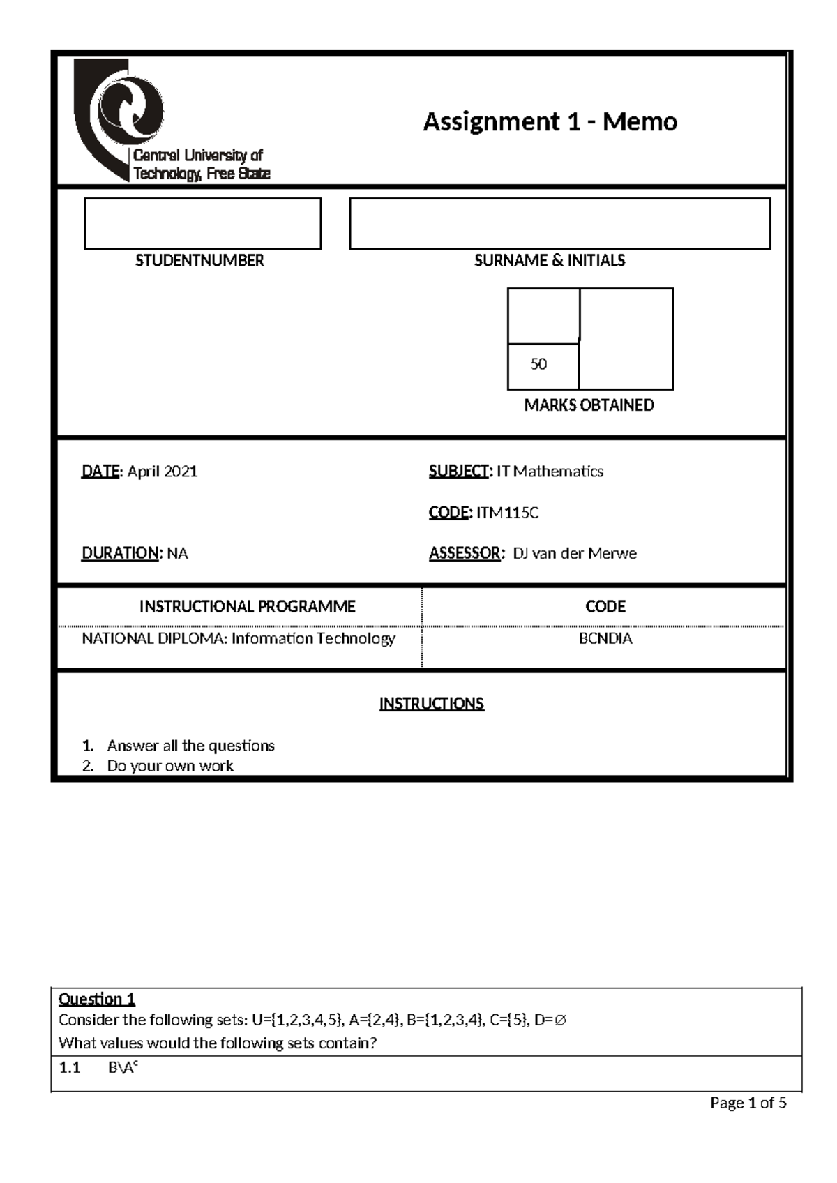 ITM115C - IT Mathematics Assignment 1 Memo & Solutions - Studocu