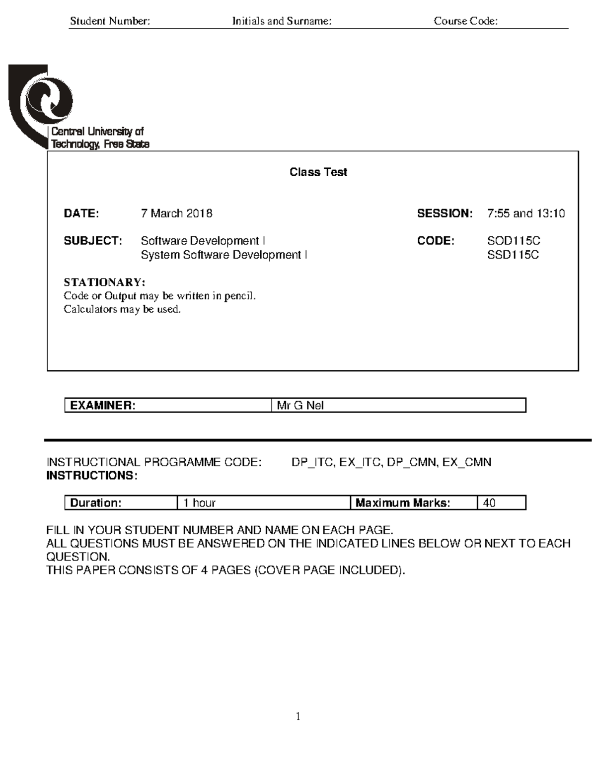 2018 SOD115C Class Test 1 - Class Test DATE: 7 March 2018 SESSION: 7:55 ...
