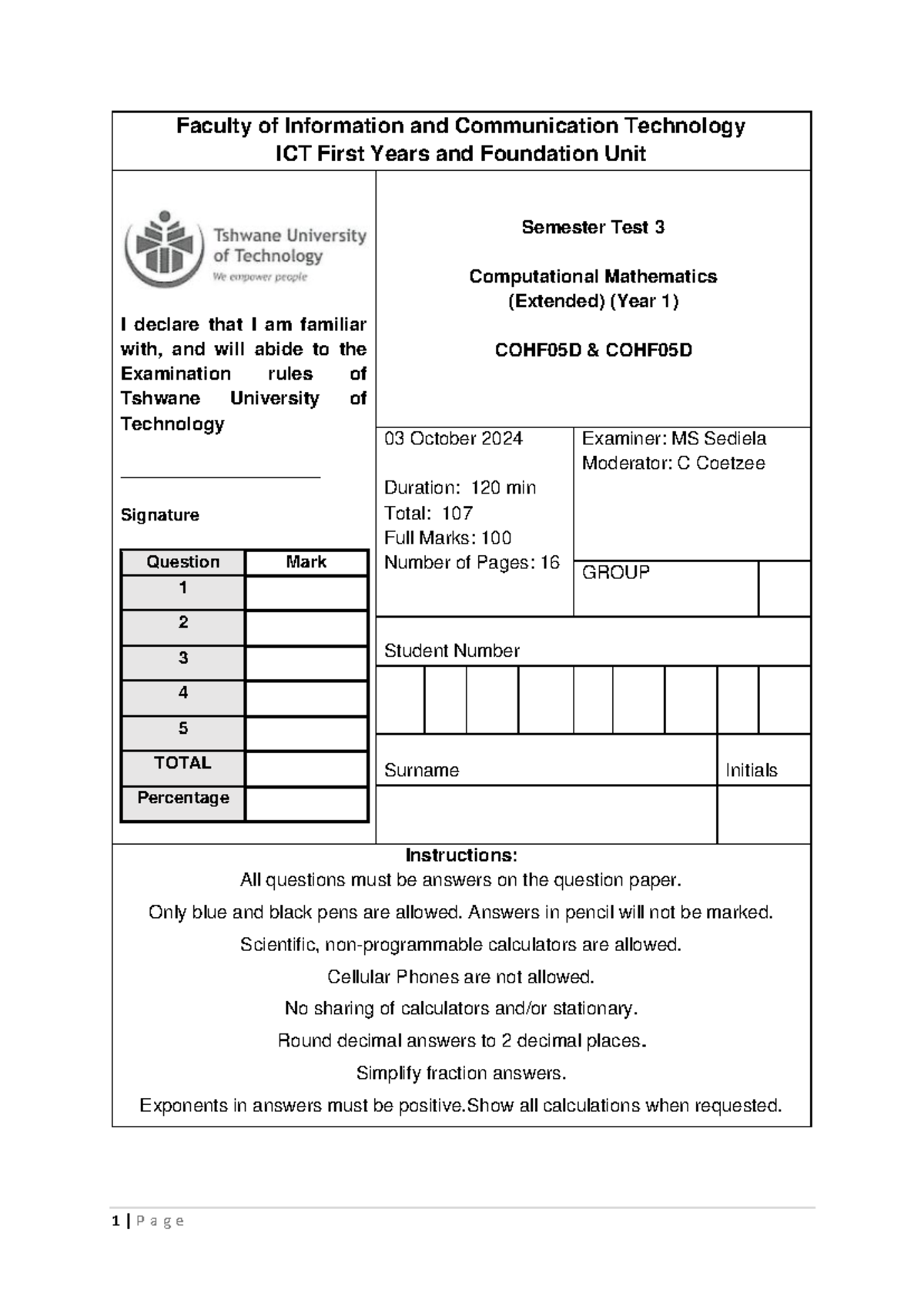 ICT First Year Semester Test 3: Computational Mathematics (COHF05D ...