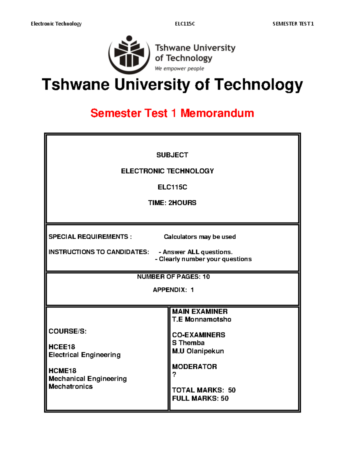 ELC115C Electronic Technology Semester Test 1 2018 Memorandum - Studocu