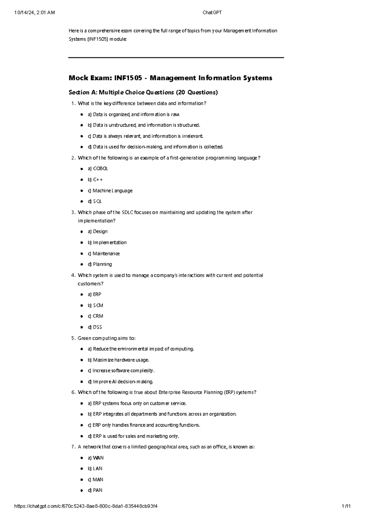 Mock Exam 2 Review: INF1505 - Management Information Systems - Studocu