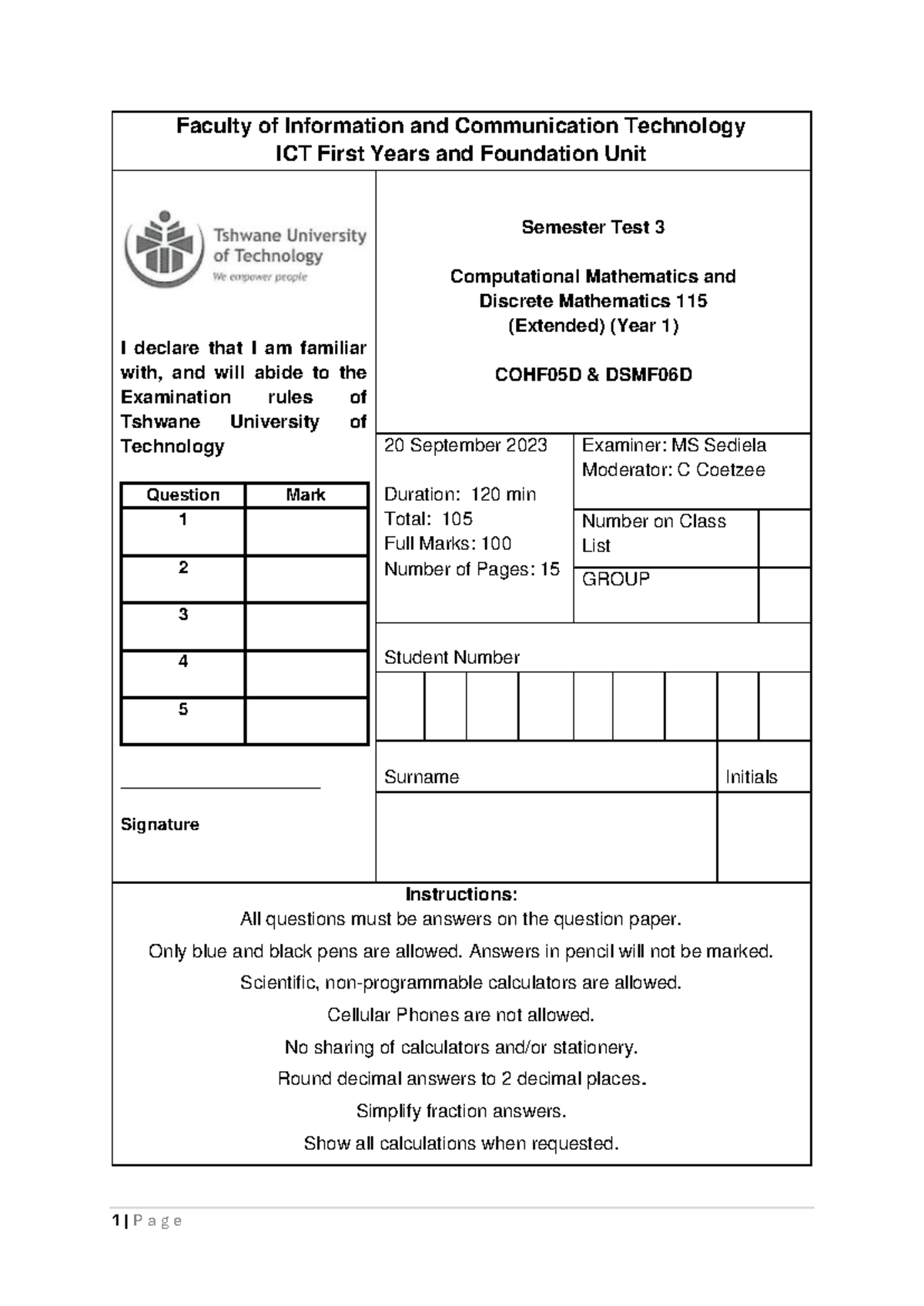 ICT 115 Semester Test 3: Computational & Discrete Mathematics (2023 ...