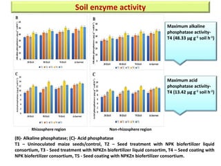 Based on this image's title: “Enzyme levels between bioinoculant treated rhizosphere soils for Non-Bt ...”