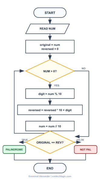 Check if number is Palindrome - Algorithm, Flowchart and Program