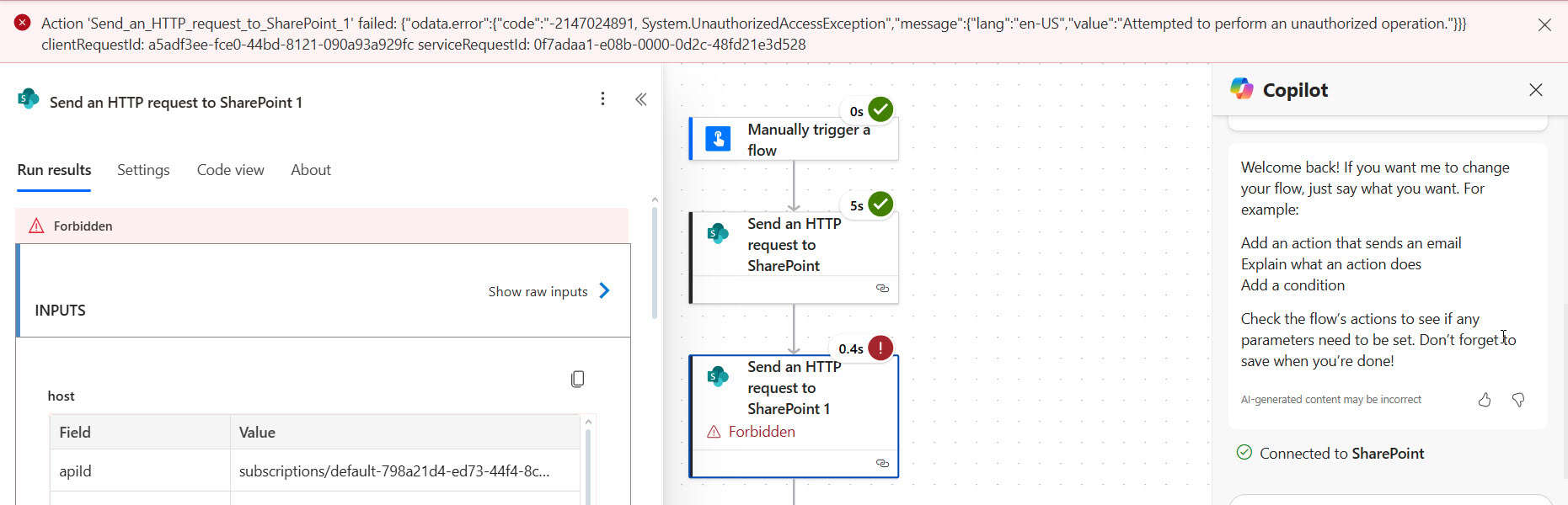 Attempted to perform an unauthorized operation in Power Automate