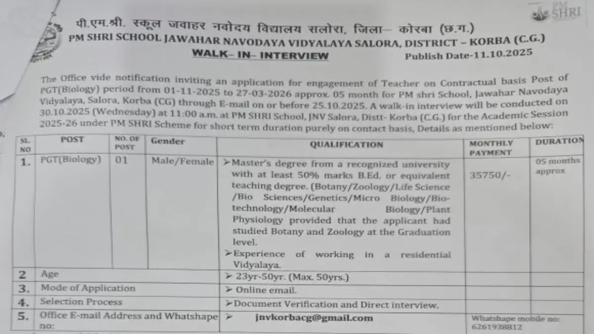 Navodaya Vidyalaya Contract Teacher Recruitment 2025: पीएम श्री स्कूल ...