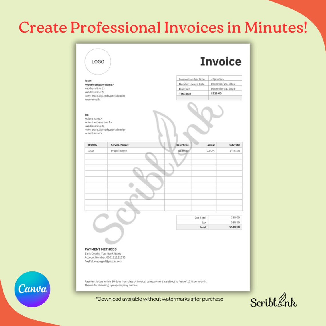 Invoice Template. Custom Invoice. Printable Invoice Form. Customizable ...