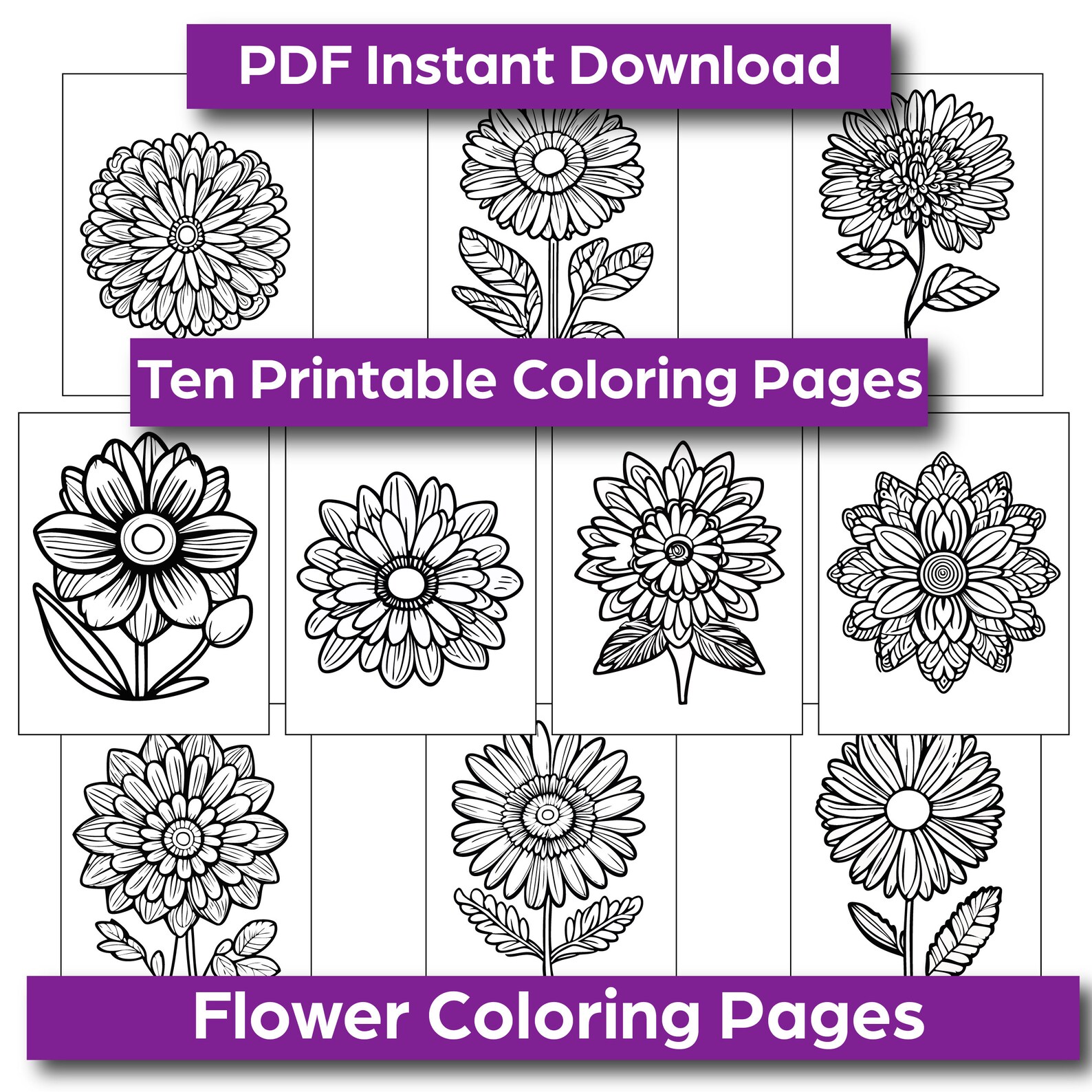 10 Flower Coloring Pages PNG Files - Etsy