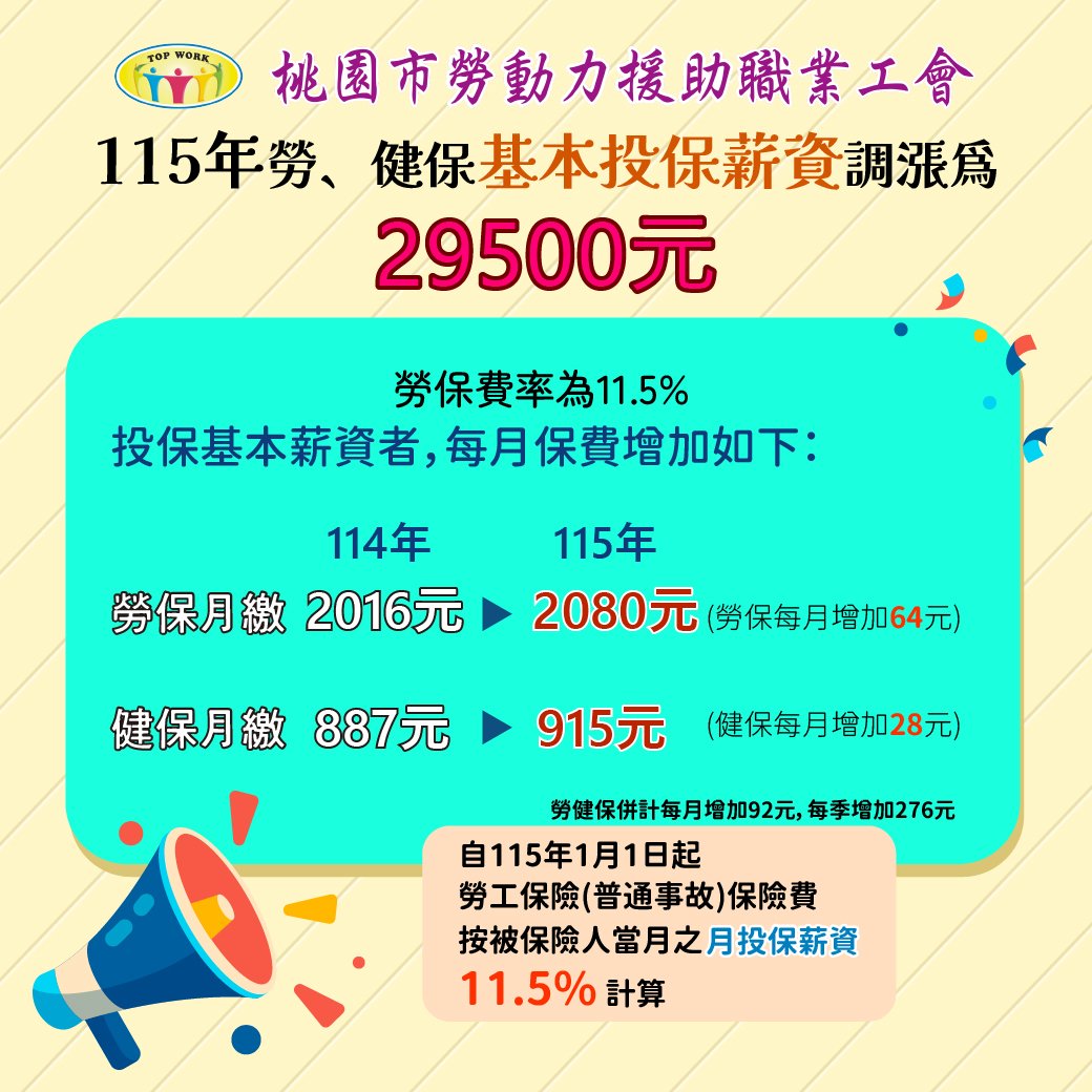 115年1月1日起, 勞、健保基本投保薪資調漲為29500元, 勞保費率維持以11.5%計收。|桃園市勞動力援助職業工會