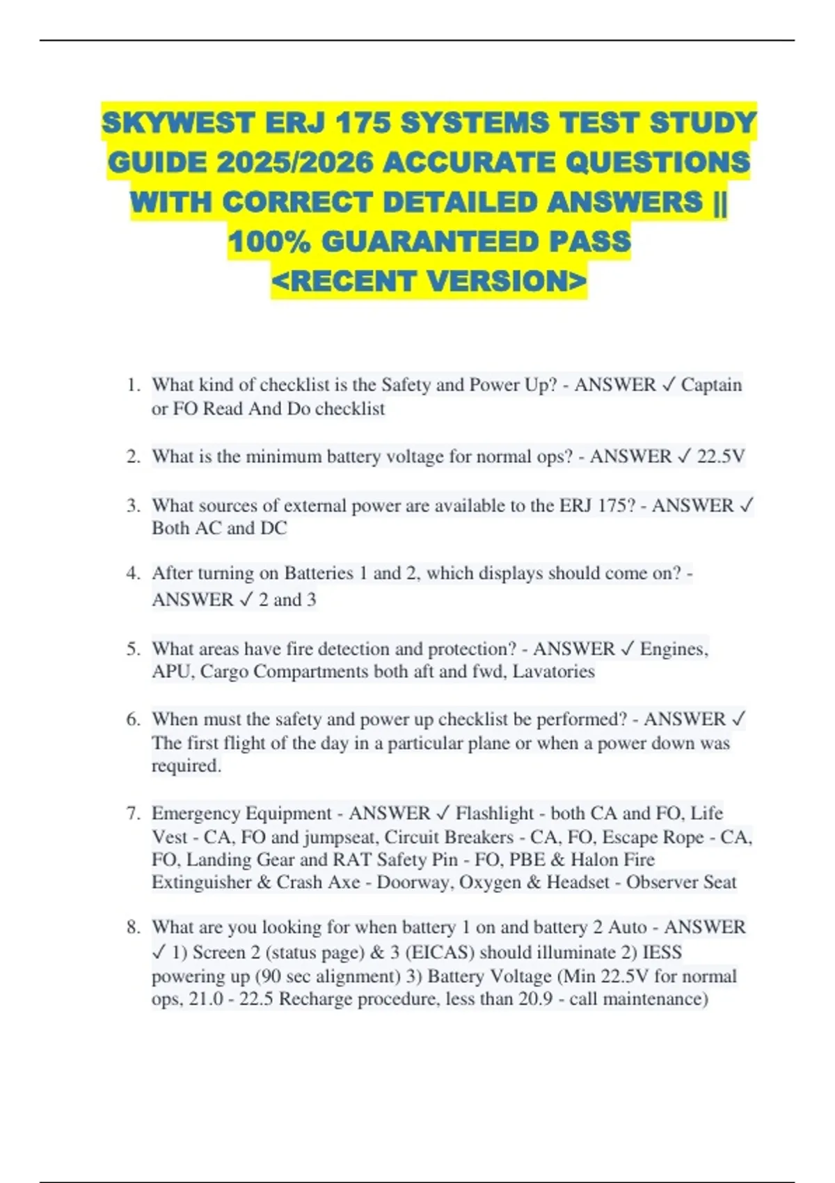 SKYWEST ERJ 175 SYSTEMS TEST STUDY GUIDE 2025/2026 ACCURATE QUESTIONS ...