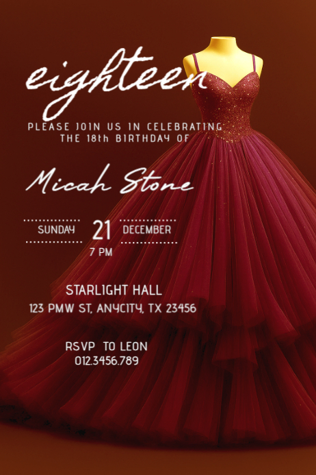 Elegant 18th Birthday Invitation | Red Gown Sweet 16 to 18th Party ...