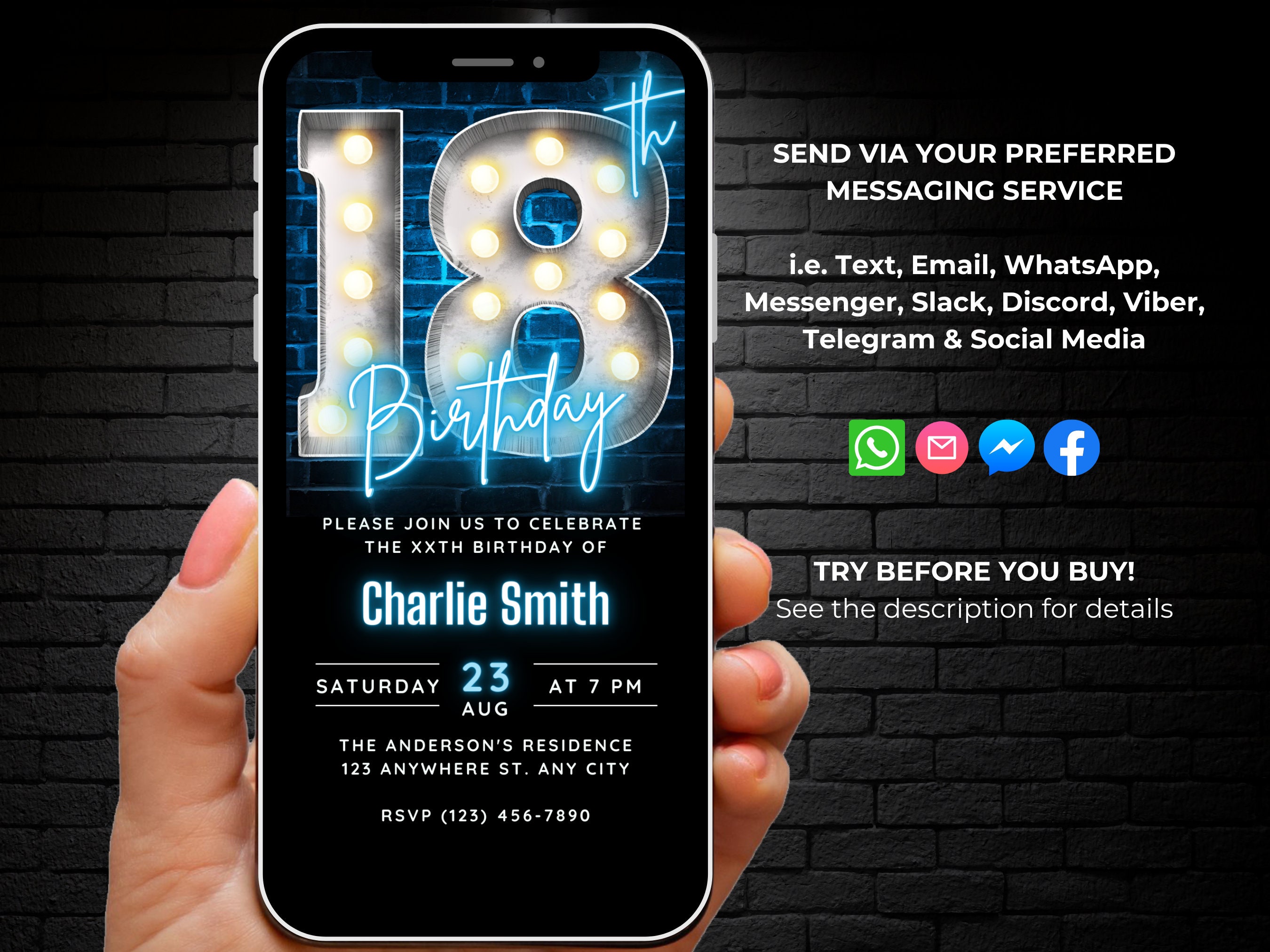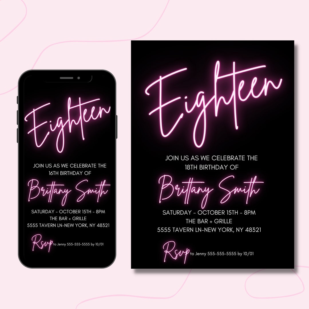 18th Birthday Invitation Digital, Editable Template, 18 Bday, Neon ...