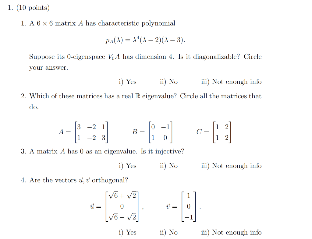 Solved 1. (10 points) 1. A 6 x 6 matrix A has characteristic | Chegg.com