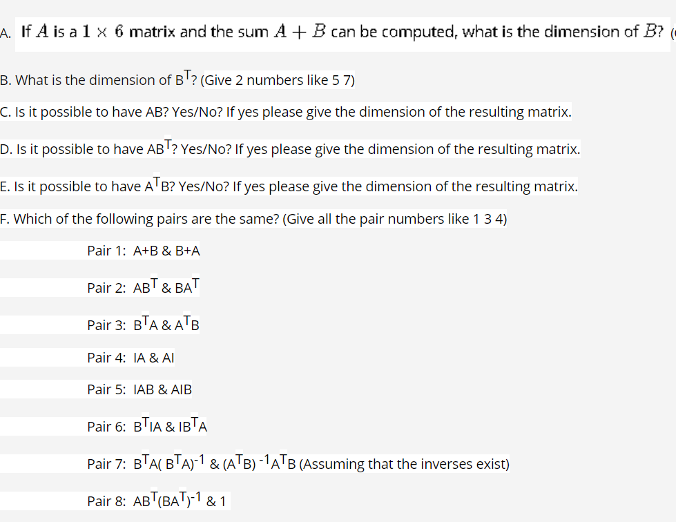 Solved Given that A is a 1x 6 matrix and B is a 7 x 1 | Chegg.com