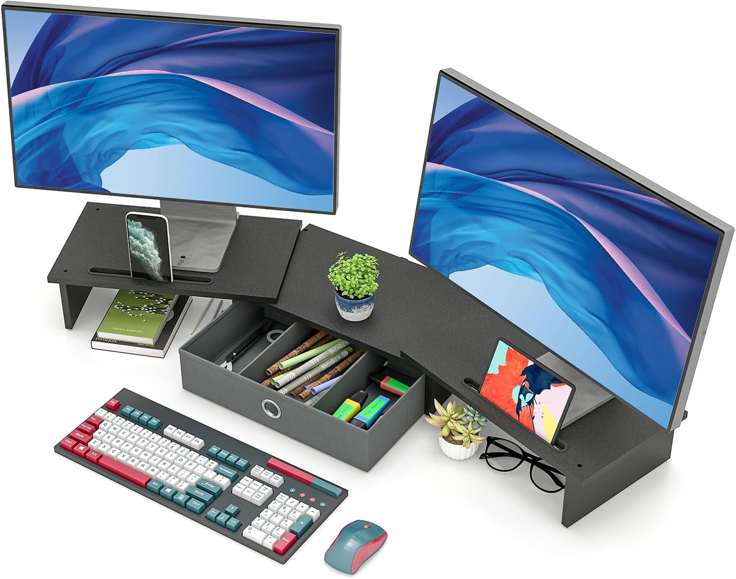 Fenge Monitor Stand with Drawer, 2 Tiers Dual Monitor Riser for Desk ...