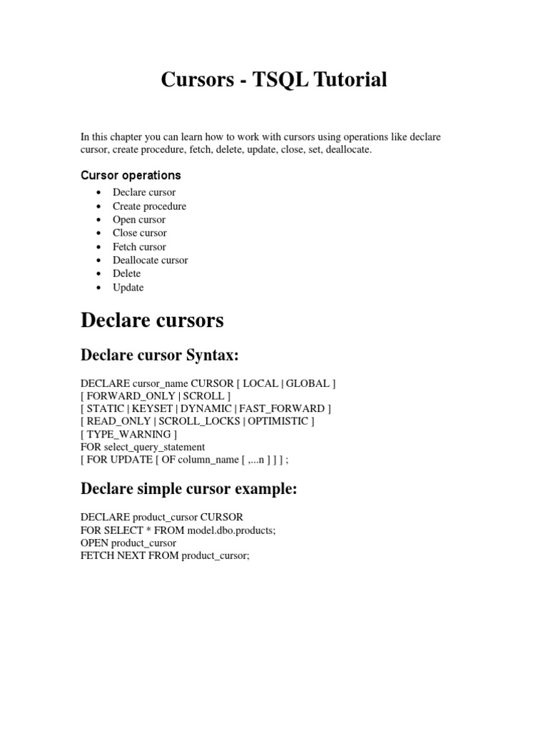 Cursors - TSQL Tutorial: Declare Cursor Syntax | PDF | Data Management ...