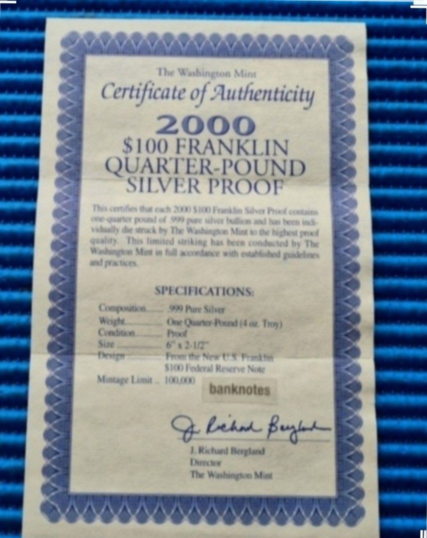 2000 United States US $100 Franklin Quarter Pound Silver Proof Note ...