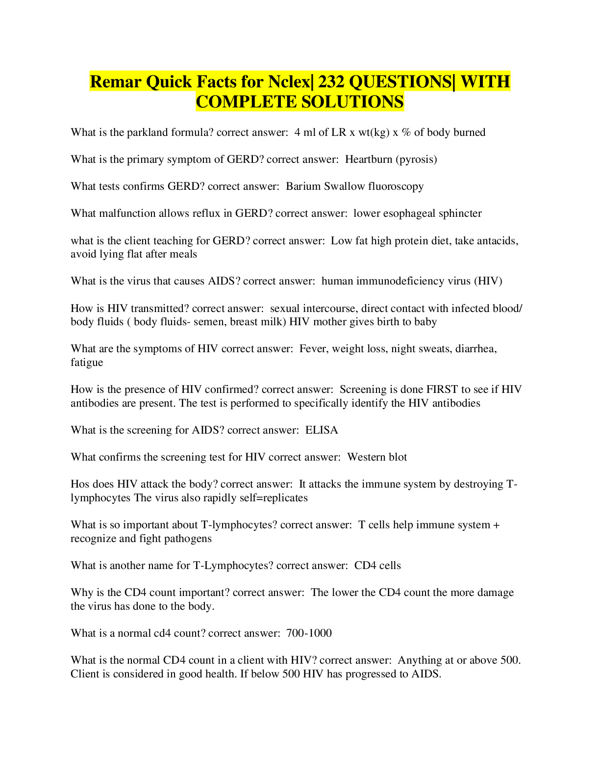 Remar Quick Facts for Nclex| 232 QUESTIONS| WITH COMPLETE SOLUTIONS ...