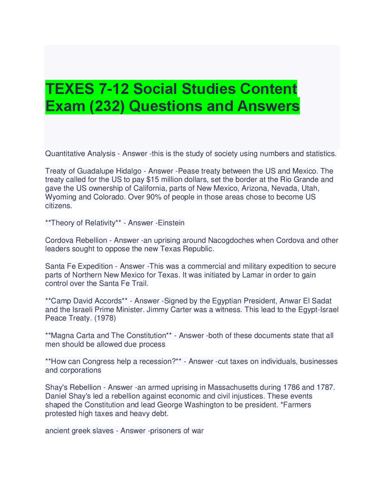 TEXES 7-12 Social Studies Content Exam (232) Questions and Answers ...