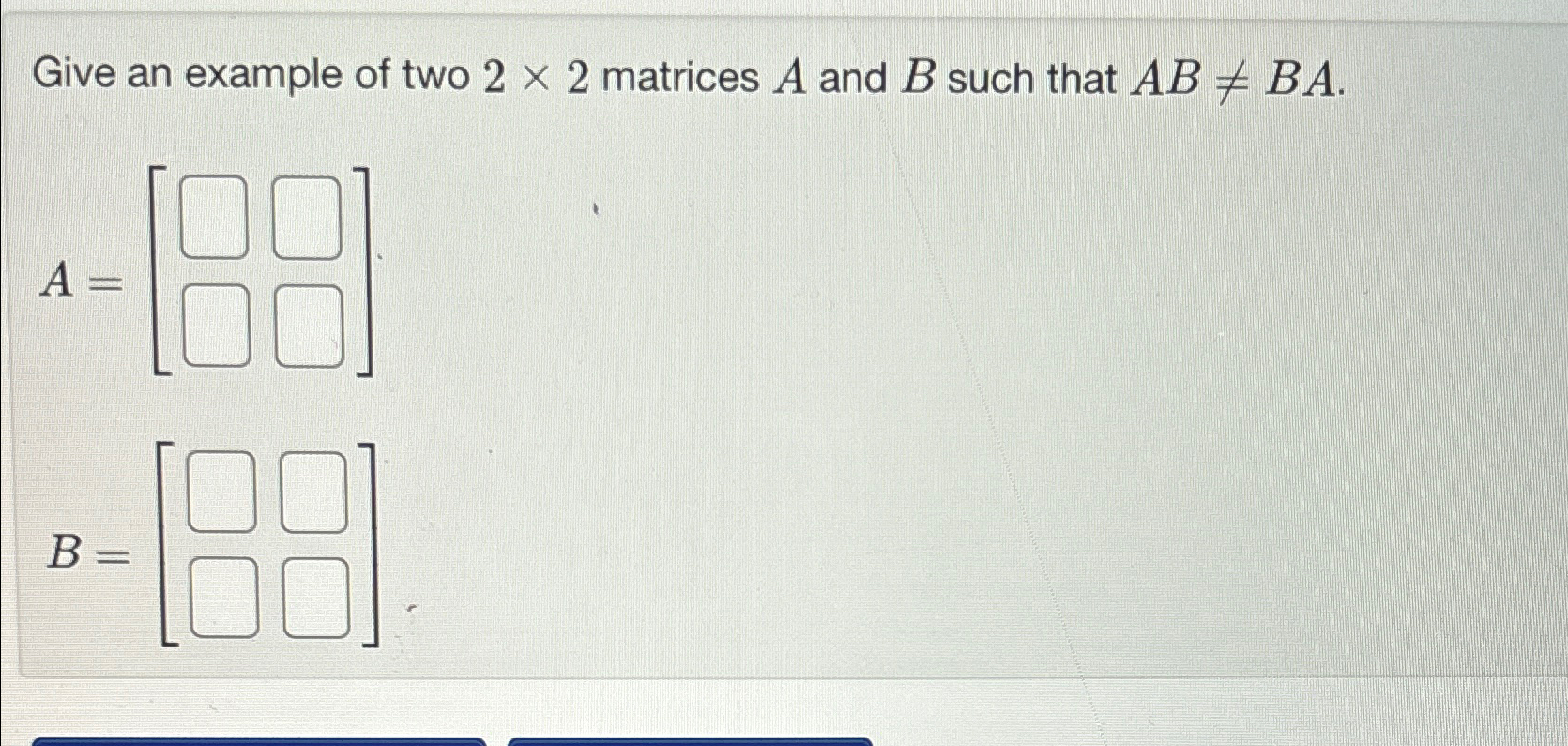 SOLVED: Give an example of two matrices A and B for which ABO = BA ...