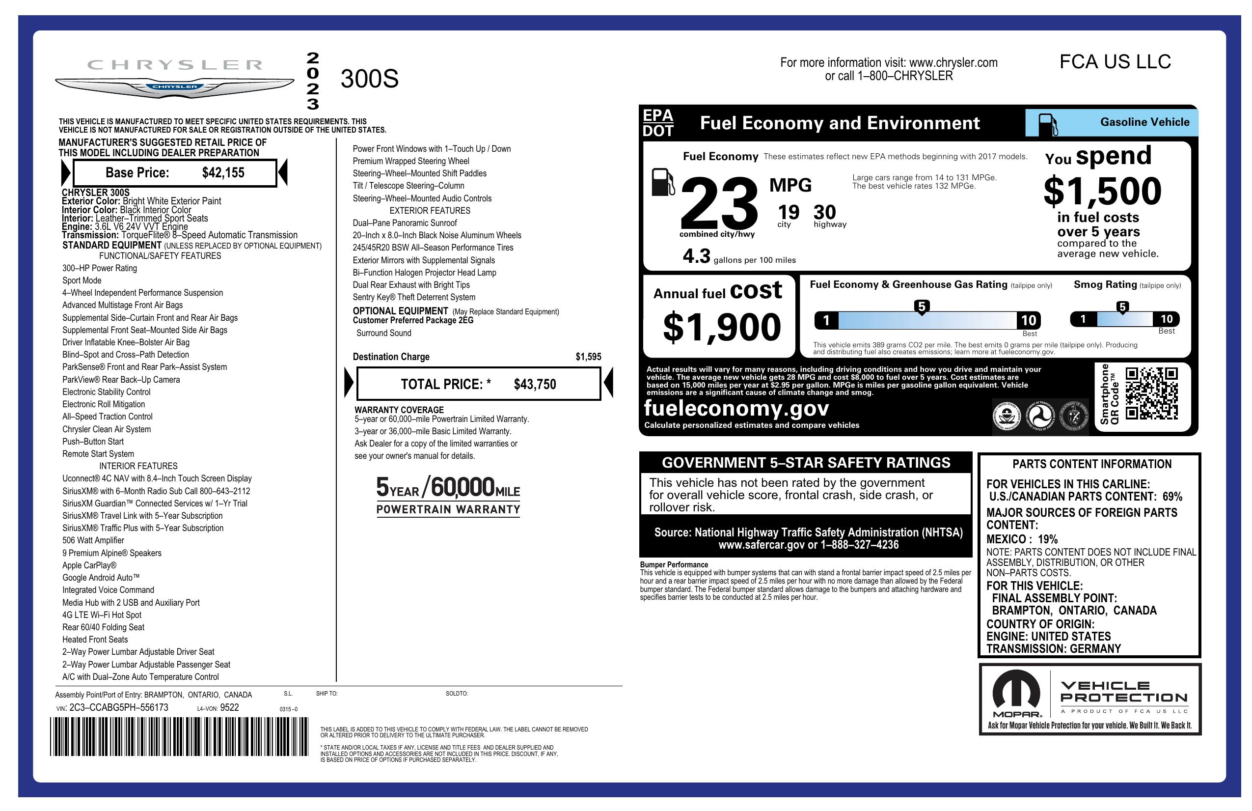 Window Sticker for 2023 Chrysler 300 300 S Rwd