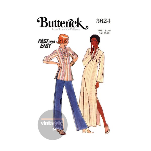 Butterick 3624 1970s Misses Fast and Easy Top and Caftan Pattern Womens ...