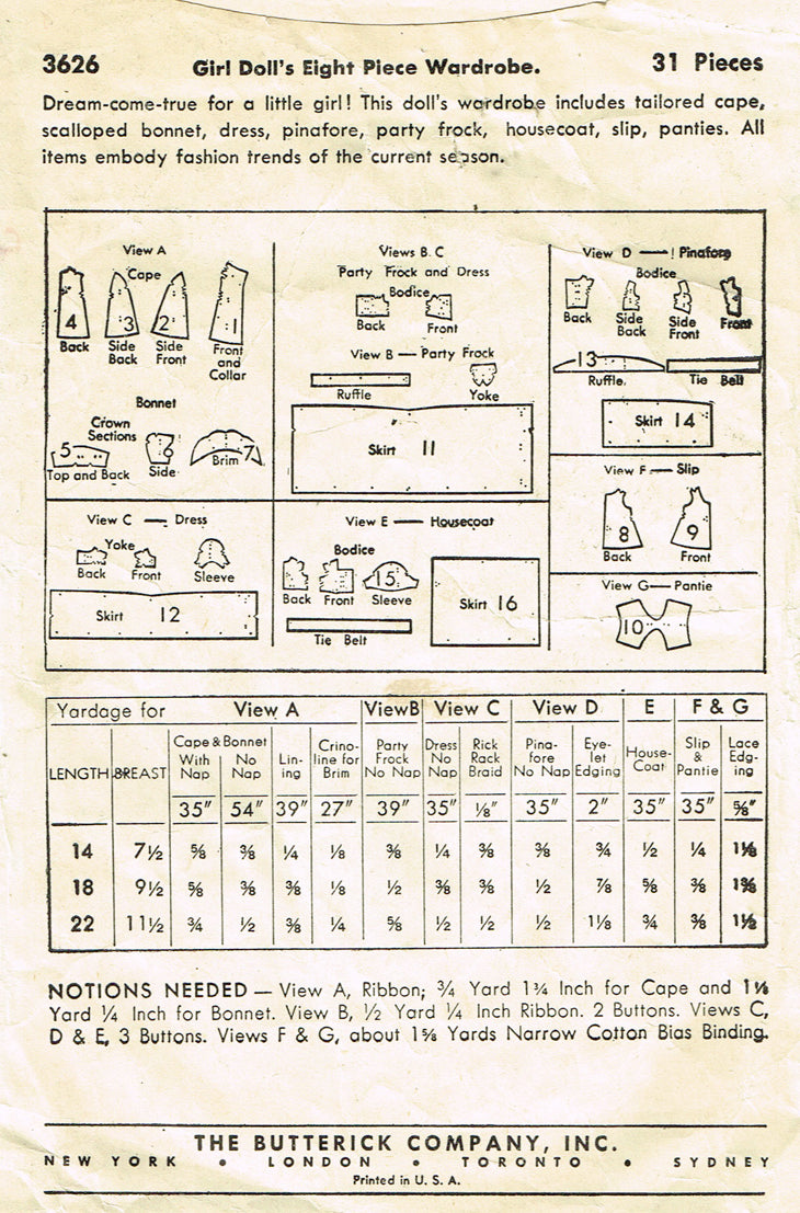 1940s Original Vintage Butterick Pattern 3626 14in Doll Clothes Set ...