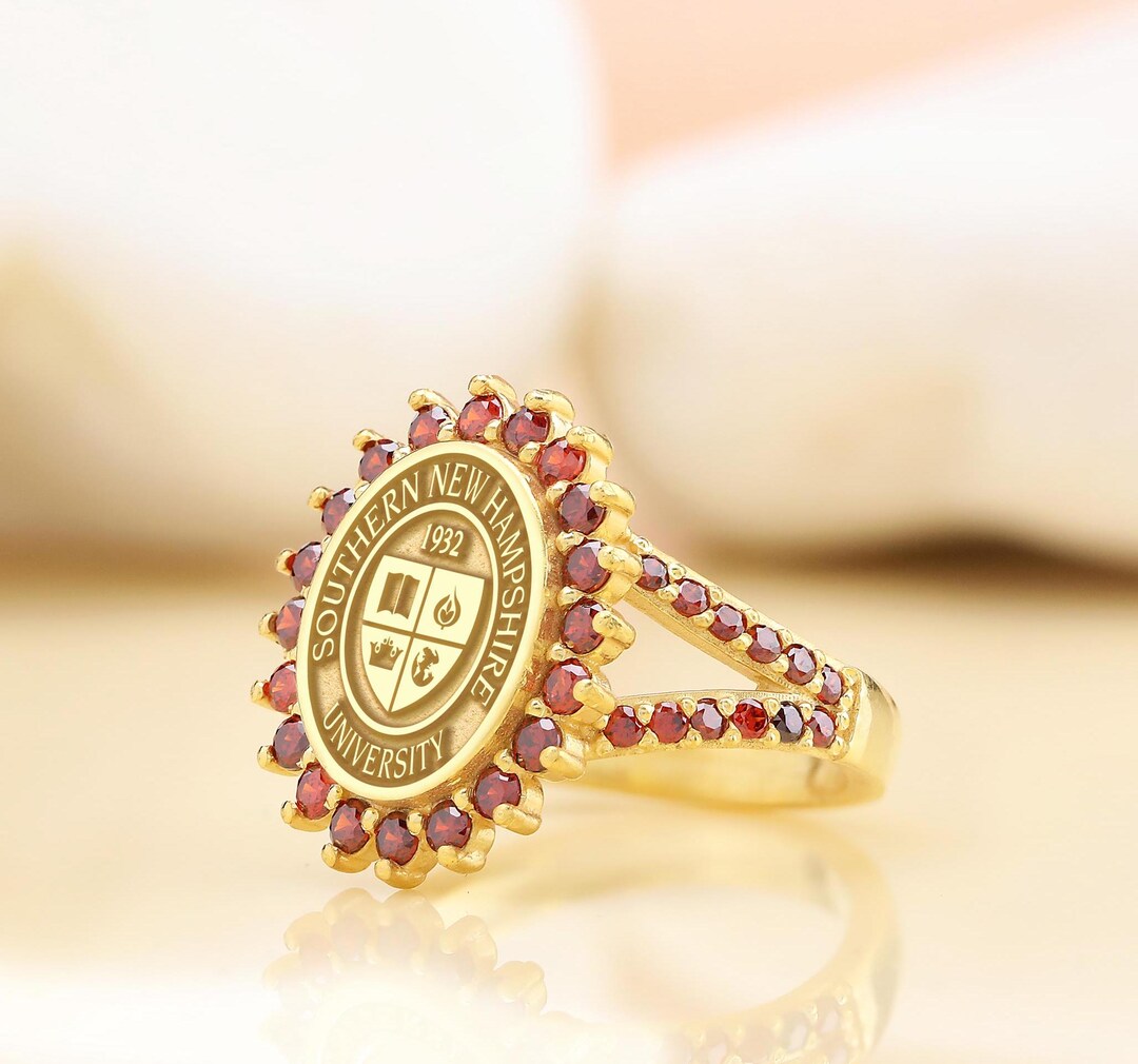 University Class Ring • Ruby Halo Crest in Gold • Personalized Grad ...