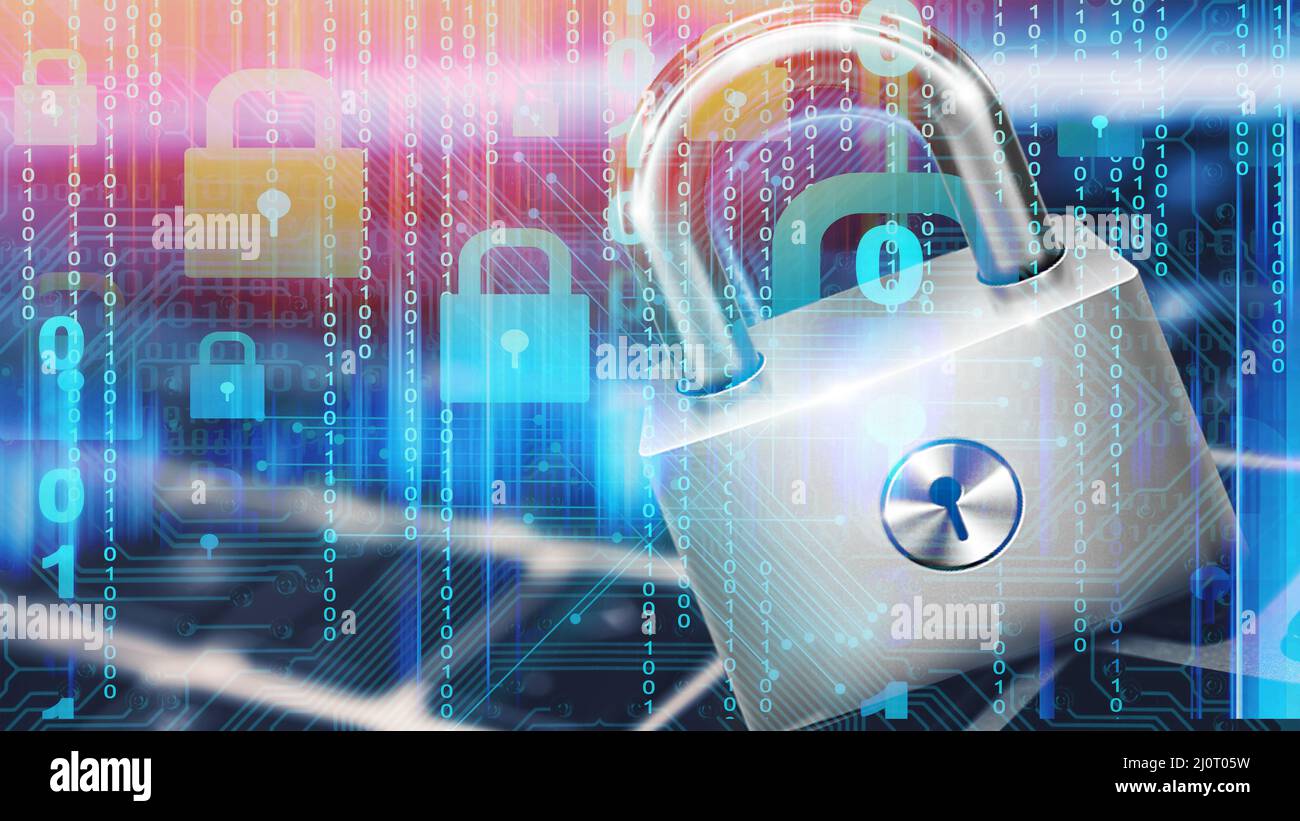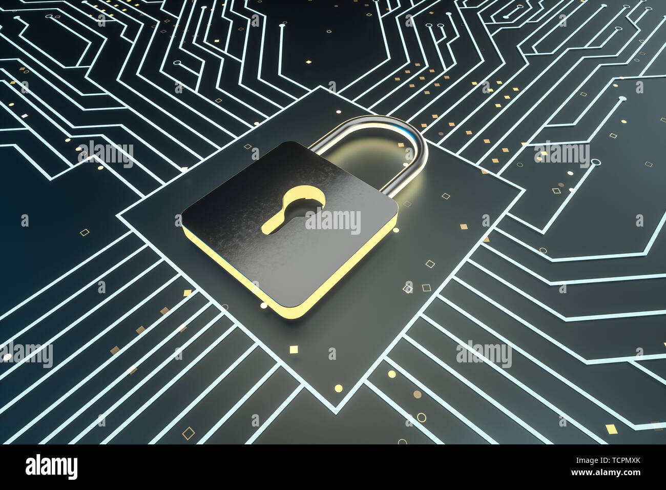 Three-dimensional rendering, metal encryption lock with tech background ...